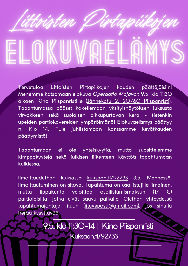 Tervetuloa seikkailijoiden ja tarpojien syysretkelle 3 Toivetta! Retki järjestetään Kaarinassa, Pyölinrannassa 7.-9.11. Tarkempaa tietoa retkestä sekä ilmoittautumislinkki löytyy liitteenä olevasta retkikirjeestä. Ilmoittauduthan mukaan viimeistään 26.10. Retken nimen mukaisesti haluamme kuulla juuri sinun kolme toivettasi esimerkiksi retken ohjelmasta, joten laita viestiä retken johtajalle Fannille (puh. 044 224 0706 tai sp fannivlehtinen@gmail.com), ja ehkä ne käyvät toteen 😉
